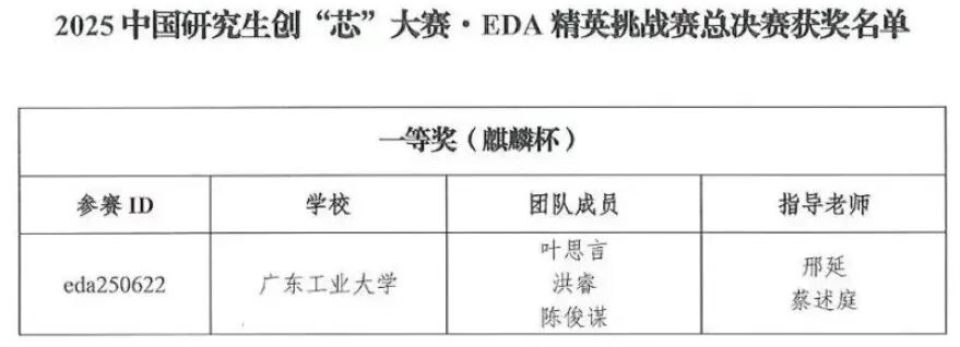 在激烈的角逐中,EDA精英赛的参赛选手们展现出团队精神、创新意识与编程能力,参赛方案在算法优化与架构设计,和对EDA交叉学科的融合上彰显出卓越的原创性与工程价值。最终EDA精英赛共诞生了一等奖21支、二等奖63支、三等奖119支优秀队伍。根据赛制,每道赛题的第一名队伍可获得参加路演资格,进行公开路演答辩,包括命题专家推荐、队伍展示、评委点评等环节,角逐最高荣誉麒麟杯(1个,奖金人民币200,000元)、菁英杯(2个,奖金人民币80,000元)。华大九天“战队”广东工业大学团队(EDA250622)凭借出色的表现,成功摘得最高奖项——“麒麟杯”桂冠,获20万元奖金!